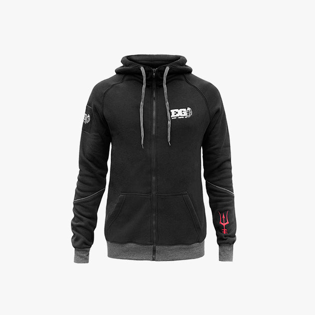 Der Dispater Hoodie ist komplett schwarz mit grauen und roten Akzenten und trägt das EG-Logo auf dem rechten Arm und der Brust. Er hat eine Kapuze mit Kordelzug und die Fronttaschen sind groß genug für Handy, Geldbörse und andere wichtige Dinge.